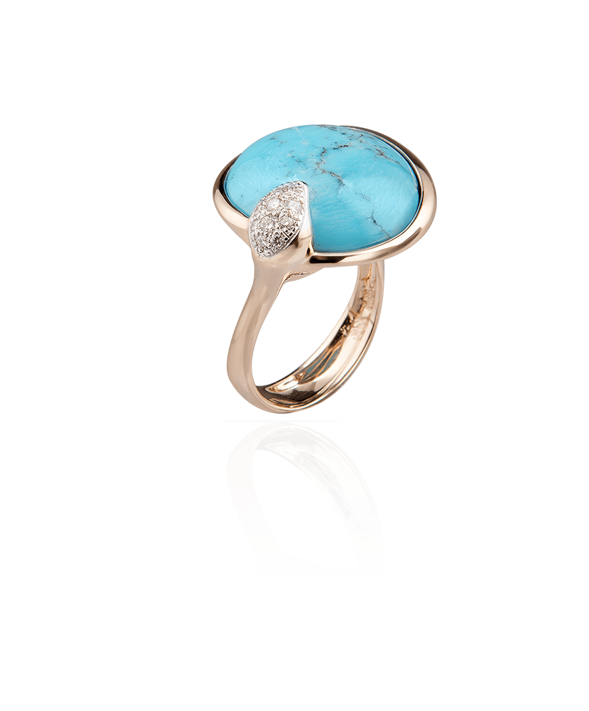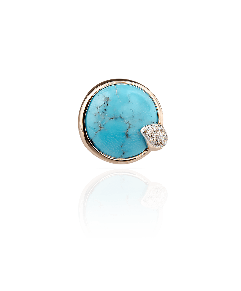 | Gemme | Diamanti 0.14Kt (peso totale) taglio brillante rotondo. Turchese taglio rotondo cabochon bottone. Provenienza Arizona. |